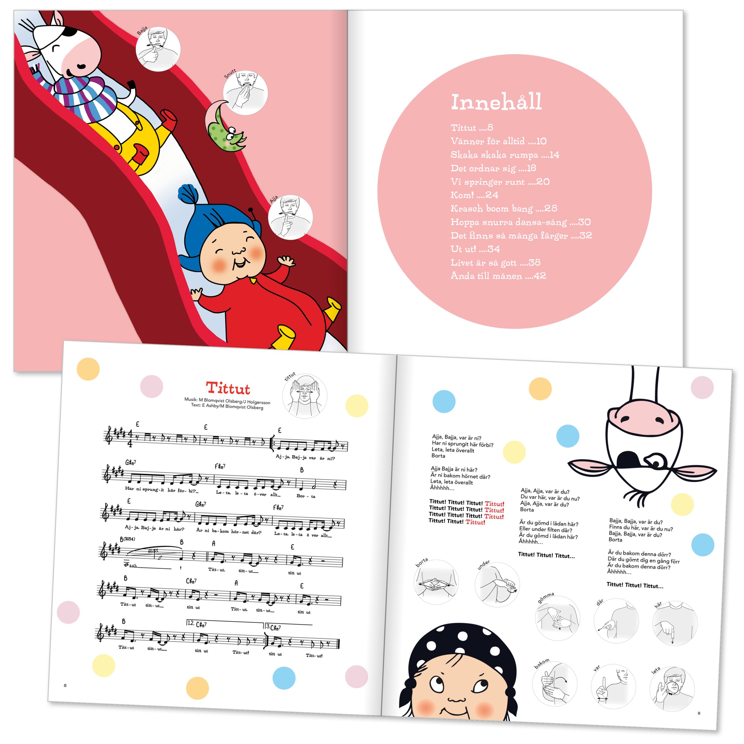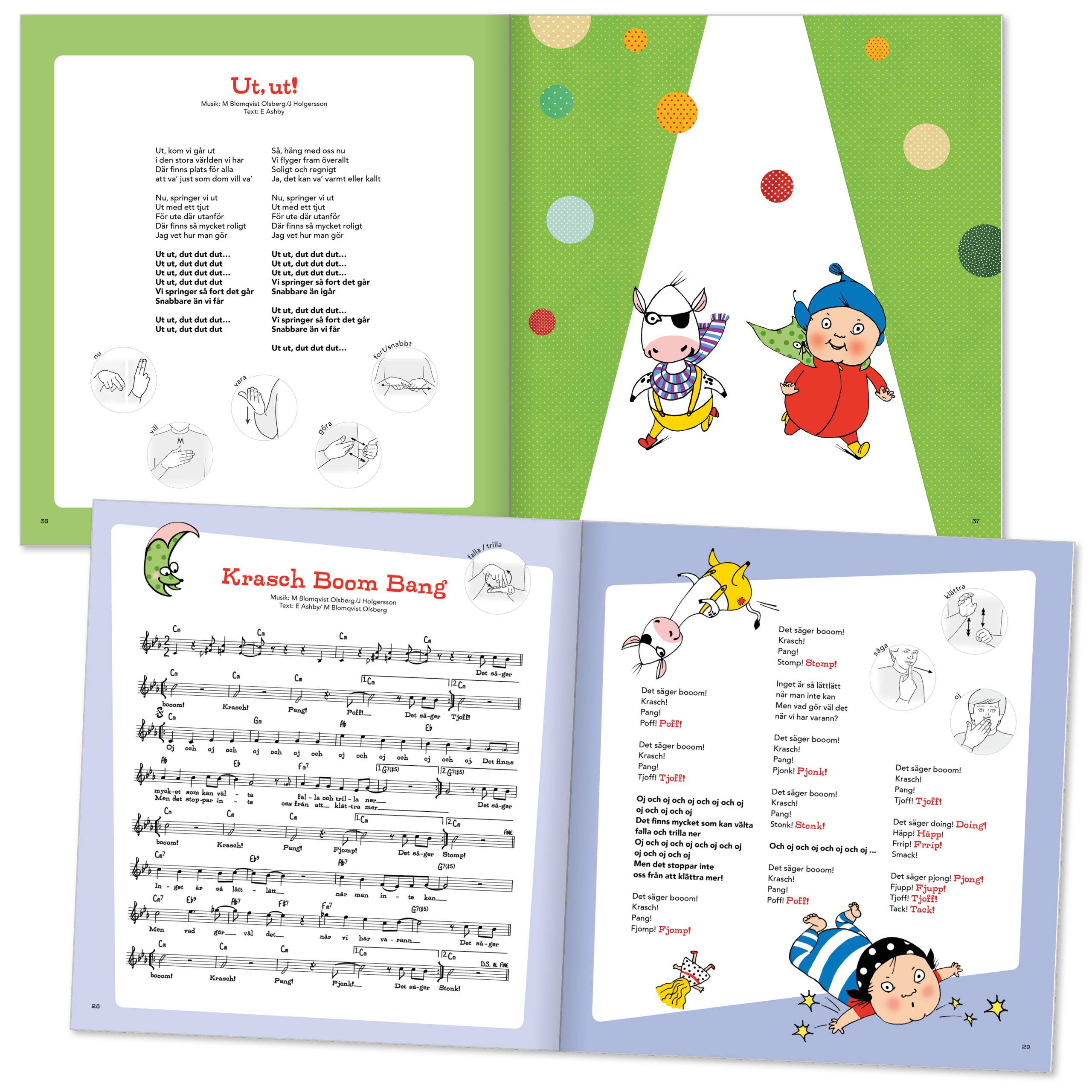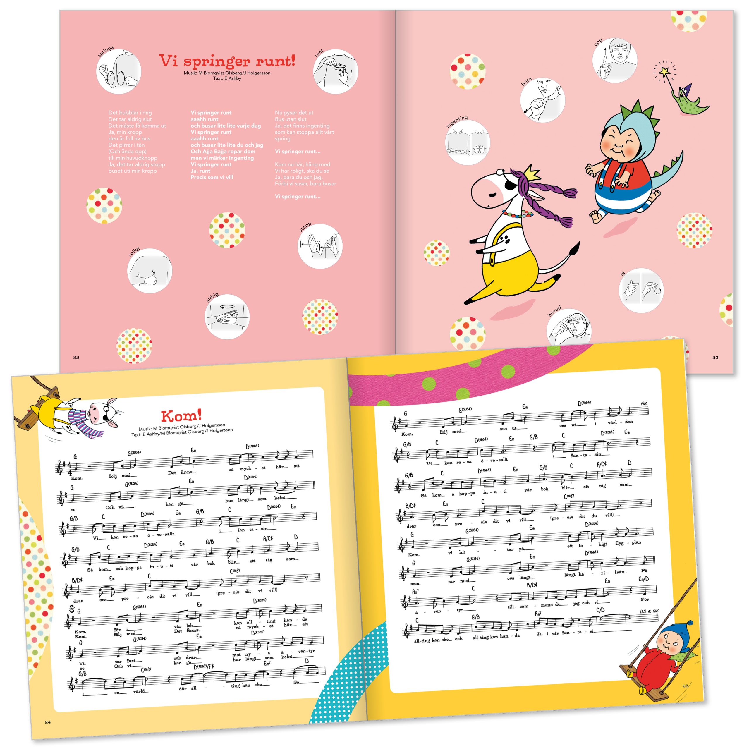 I denna stora och härligt illustrerade sång- och notbok hittar ni noter, ackord och text till alla Ajja & Bajjas svängiga sånger. Med teckenillustrationer för den som vill teckna till, och roliga bilder att titta på och prata om innan ni sjunger och dansar tillsammans!