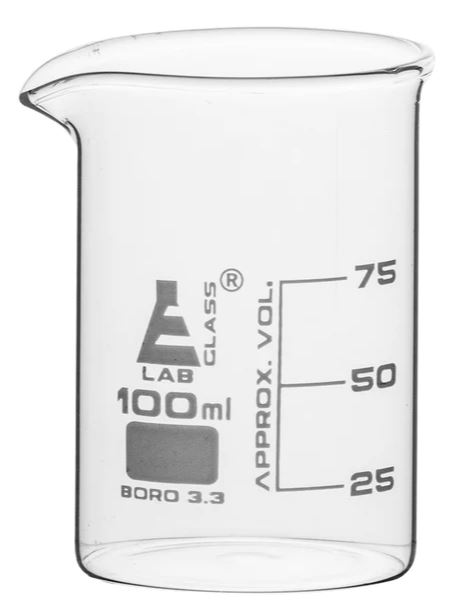 Bägare av låg modell av värmetåligt borosilikatglas, med pip.