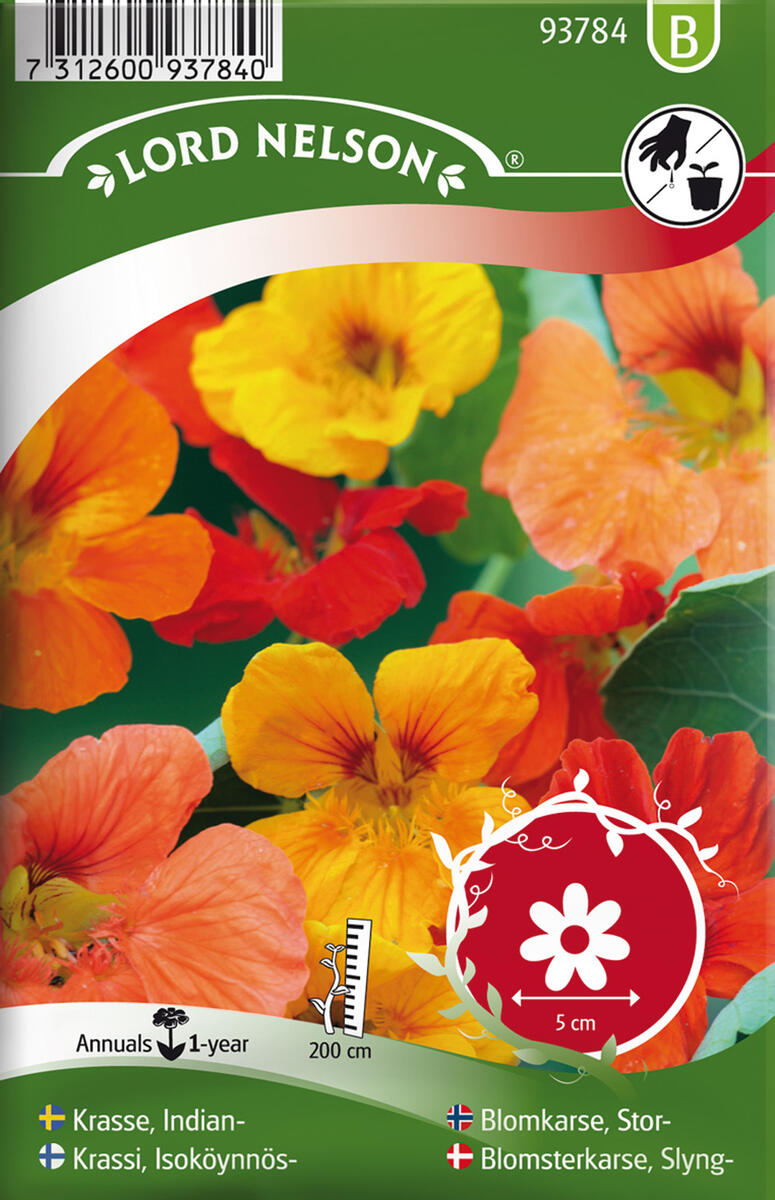 4,5 g/fp. Klassisk slingerkrasse med färgstarka och ätbara blommor. Plantorna kan bli upp till 2 m. Lägg frön i ljummet vatten ca ett dygn innan plantering. Plantera helst i mager såjord. Så- och planteringsanvisningar på fröpåsen.