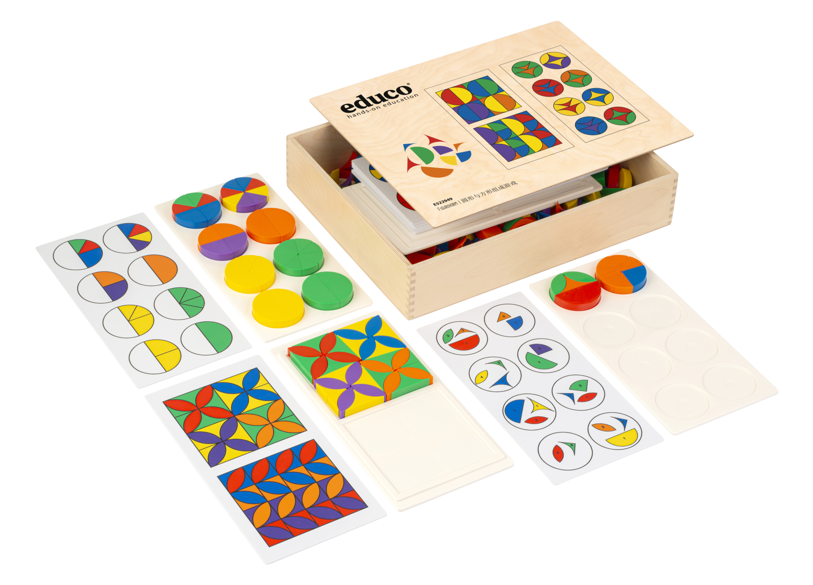 4 ramar i plast som kan användas på båda sidor. 8 stora dubbelsidiga uppgiftskort, 312 former i plast (6 former i 6 färger). Trälåda för förvaring ingår. Med detta materialet tränas färg- och formigenkänning men även mönster och symmetri. Materialet erbjuder också oändliga sätt att se på en cirkel och hur den är uppbyggd. På ett lekfullt sätt upptäcker barnen på så sätt bråk (1/2, 1/3 o.s.v.). Manual på engelska ingår. Mått på ramarna och uppgiftskorten: 32×16 cm, trälådan: 42x33x9 cm. Från 4 år.