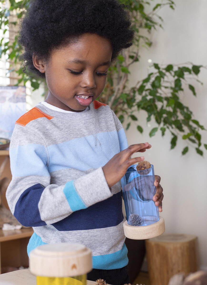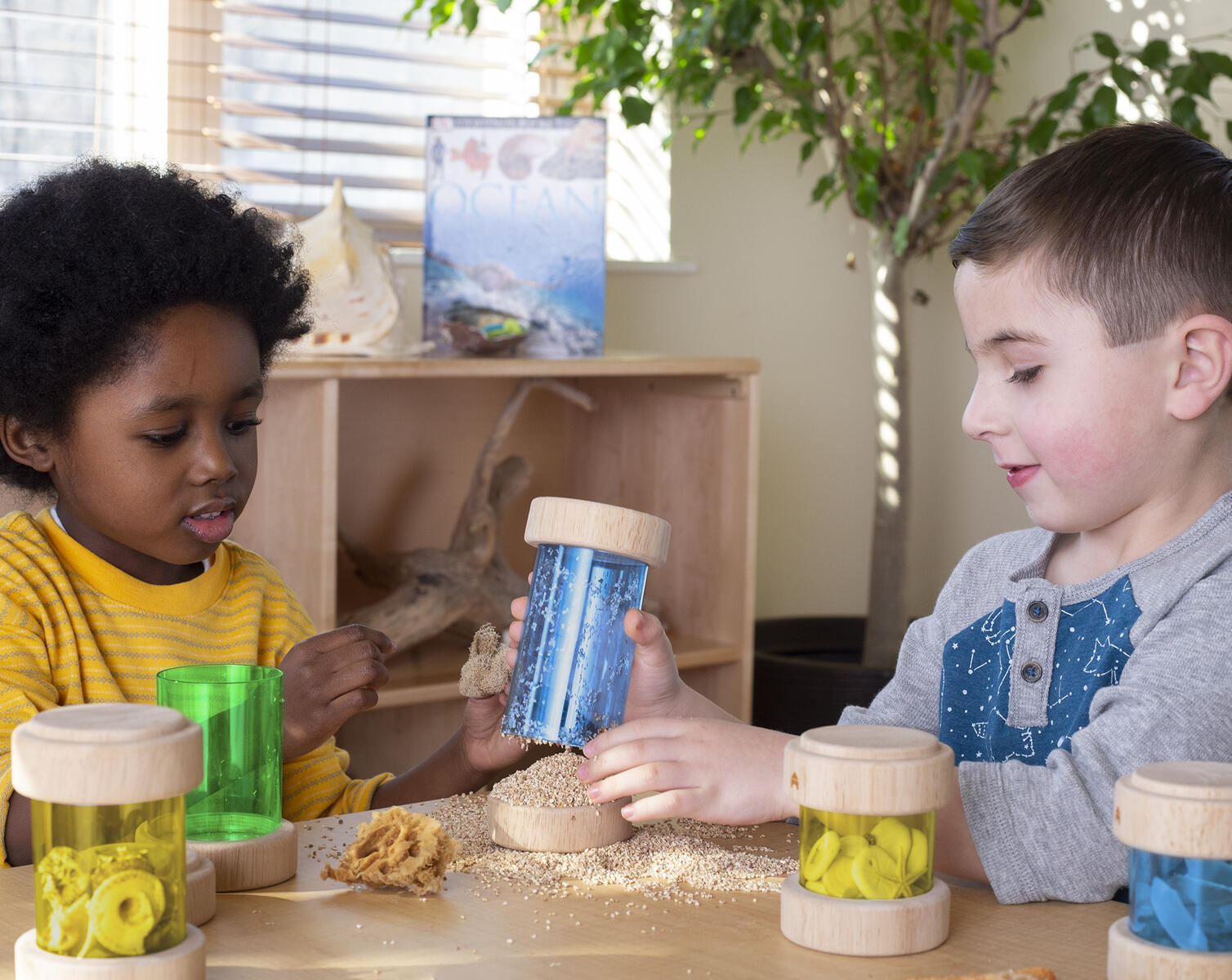 Burkar i olika färger med avtagbart lock så att man själv kan stoppa i vad man är intresserad av. Stoppa t.ex. i små kottar eller pärlor, lyssna på ljudet när behållaren skakas. Går även bra att stapla. Undvik vätskor och vått material.