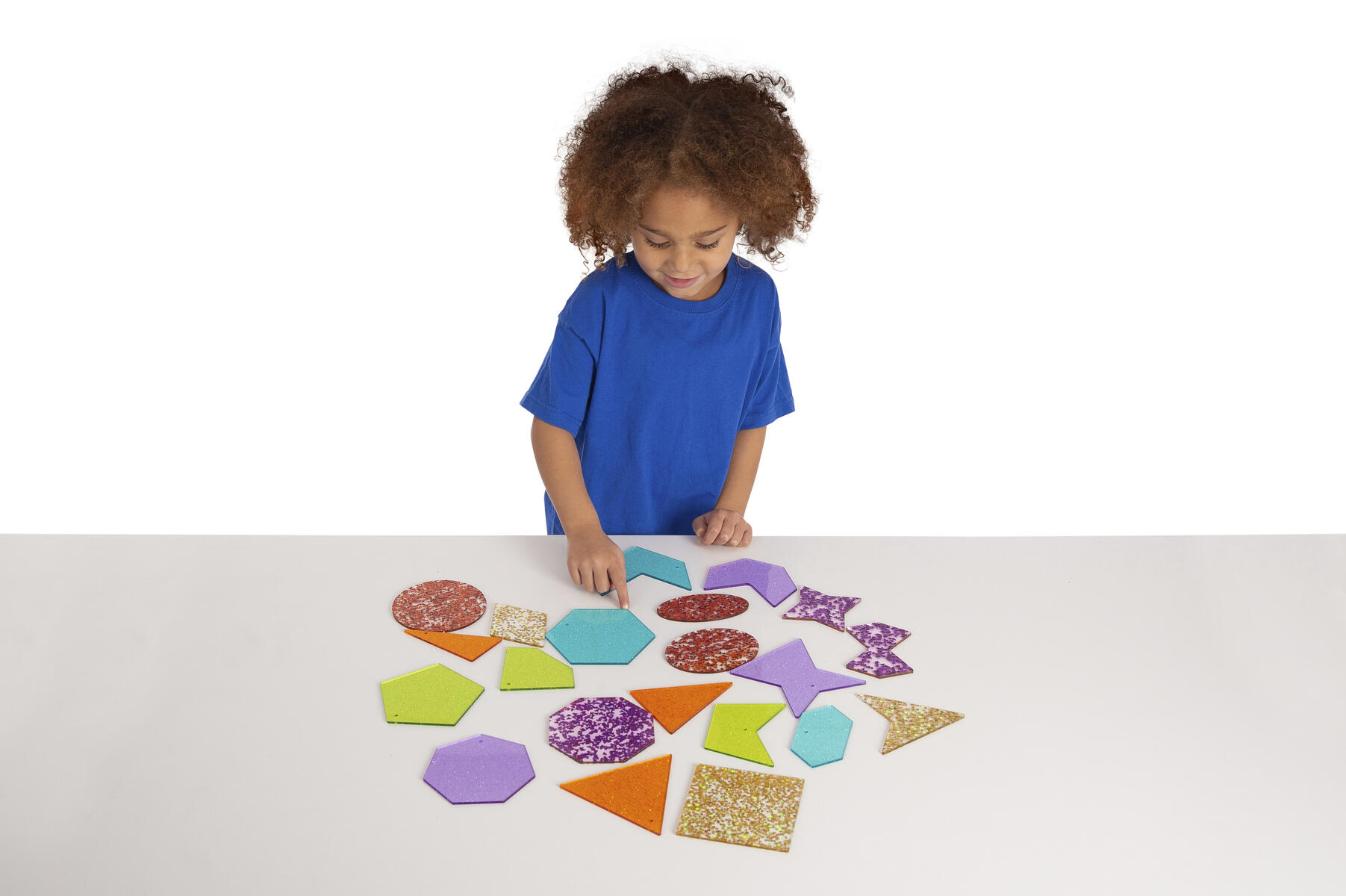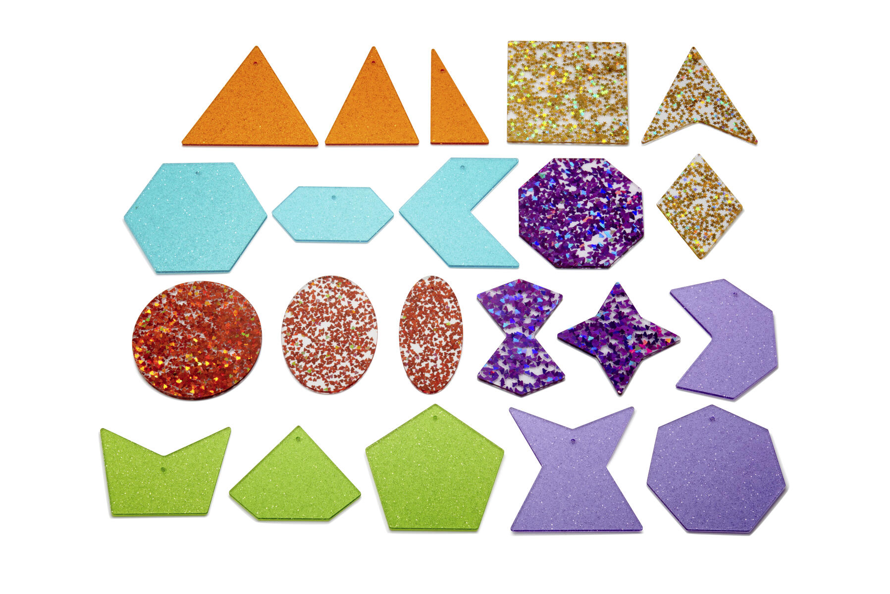 Glittrande former i 7 färger. Varje färg finns i 3 olika polygoner, regelbundna och oregelbundna. Idealiska för att förstå enkla geometriska principer. Gjorda av akryl och används med fördel på ljusbord eller upphängda i ett fönster. Mått: ca 10 cm. Från 3 år.