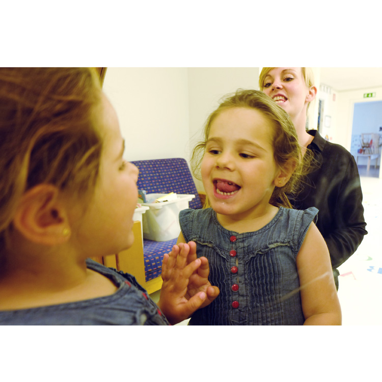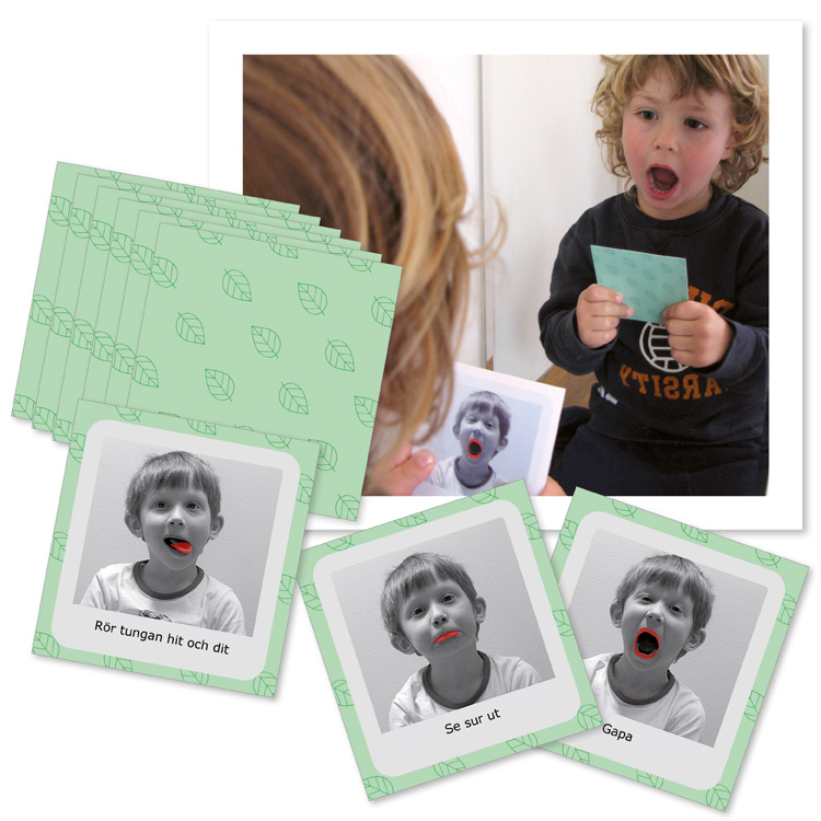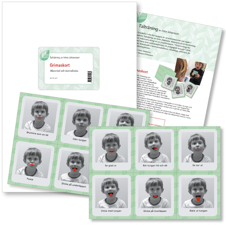 Levereras med instruktioner och lekförslag. Grimaskorten visar två olika typer av mun- och tungrörelser, dels sådana mun- och tungrörelser som inte är direkt knutna till språkljuden, dels sådana rörelser som vi gör för att bilda olika ljud.