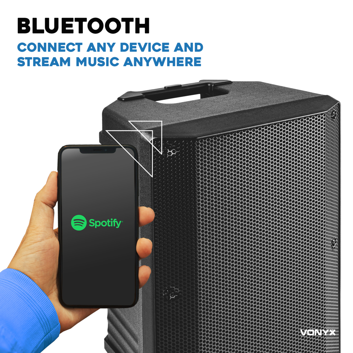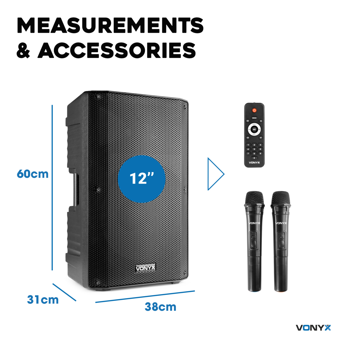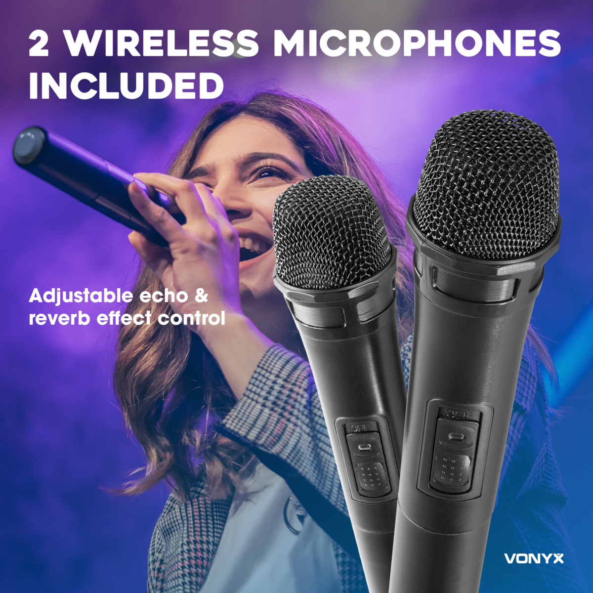 Trådlös, portabel högtalare som kopplas till smartphone eller platta. Koppla in de två tillhörande mikrofonerna, en mixer eller annan ljudkälla via Bluetooth. Inbyggd multimediaspelare (USB), digital LCD-display, inbyggd equalizer, gitarr-, stereo line- och mikrofoningångar samt mix output (XLR). Fjärrkontroll och kabel (4 m NL2).