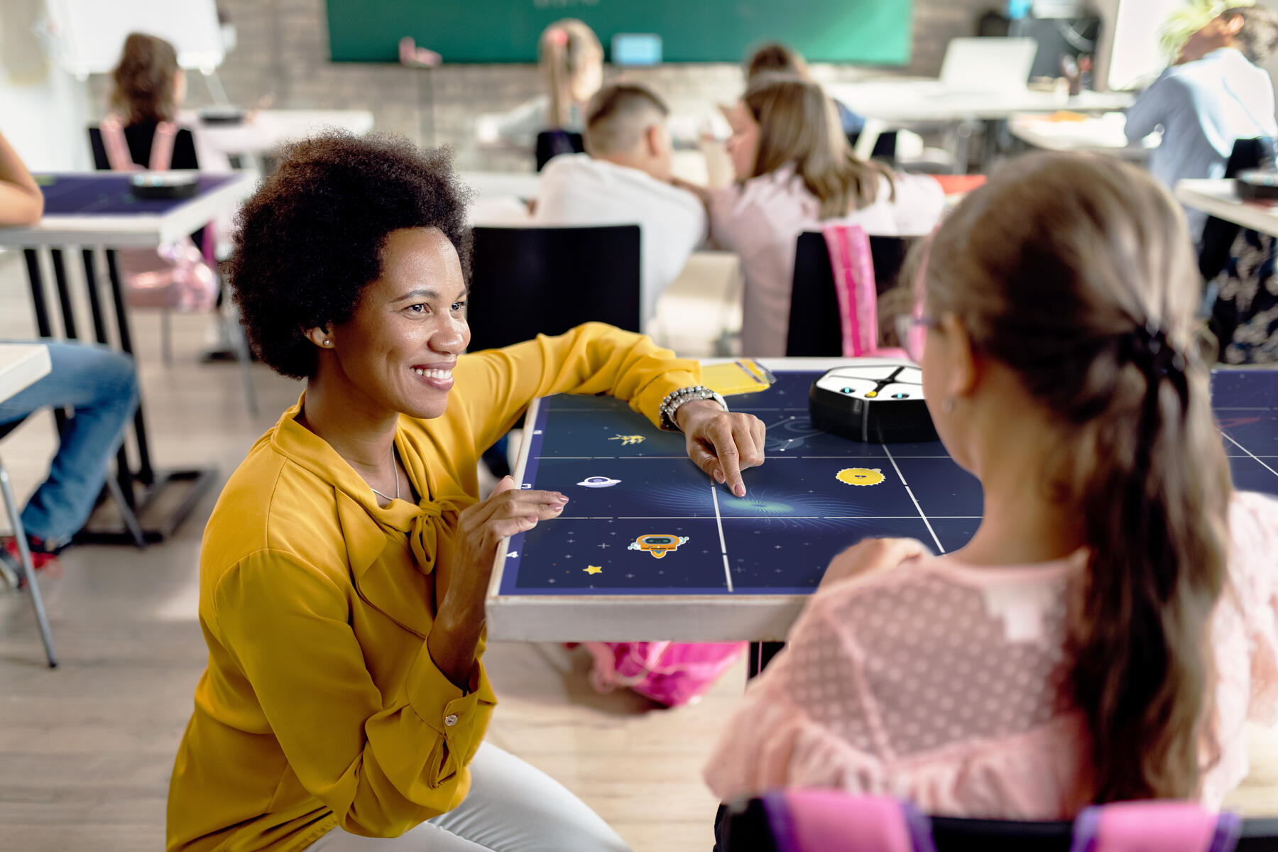 Använd Root till att utforska rymden. Spelplan med rutnät för enklare programmeringsövningar. Från 6 år.