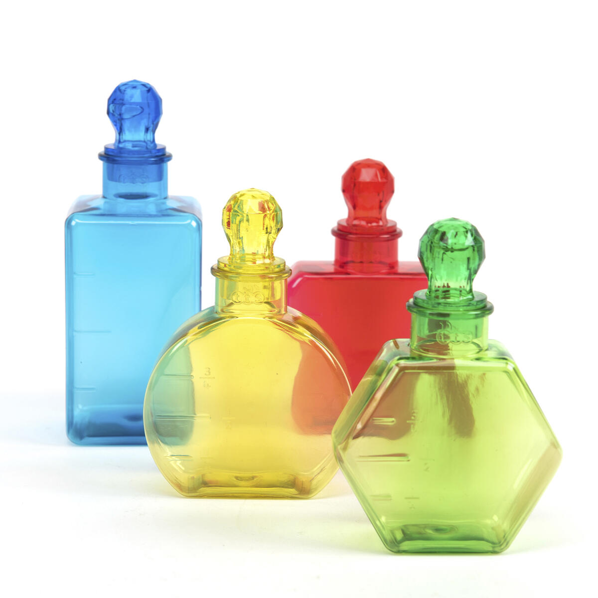 4 st/fp. Ett set med transparenta mindre mätflaskor med udda former och storlekar. Varje flaska har graderingsmärken på sidan som visar halv- och helfull osv. Barn kan fylla och tömma samtidigt som de diskuterar flaskans volym, vilket skapar engagemang i matematikaktiviteter. Passar sand- och vattenlek och fungerar lika bra inne som ute. Av PET. Mått på största flaskan: L5xB5xH15 cm. Från 3 år.