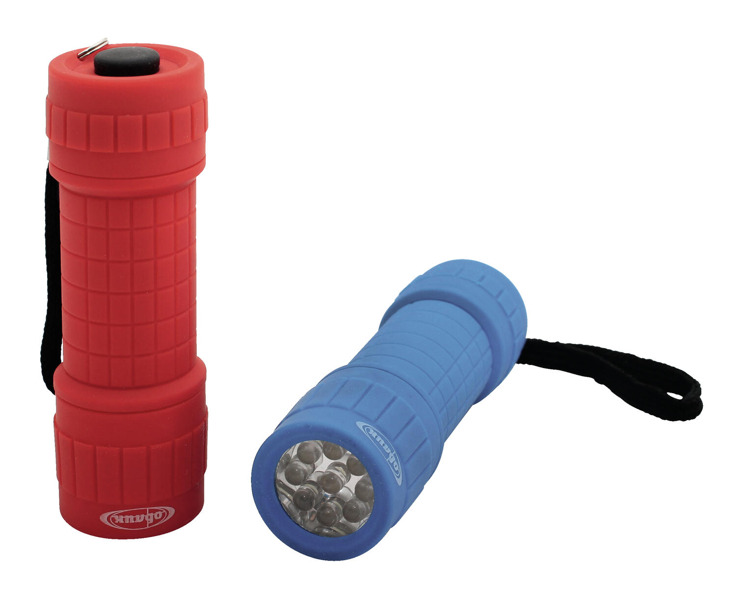 4 st 9-ledlampor som drivs med 3 AAA-batterier, ingår ej. Levereras i blandade färger: röd och blå.