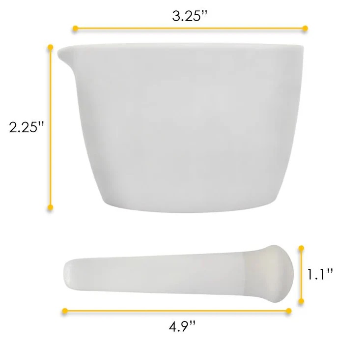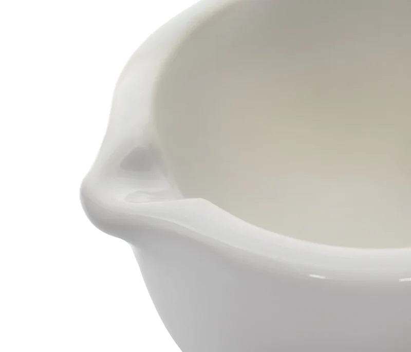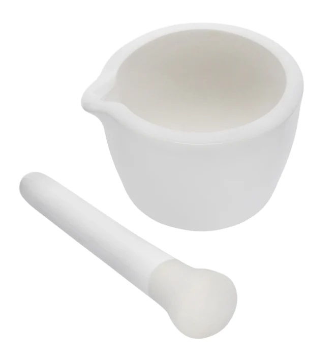 Enkel och kraftig mortel inkl pistill med en kapacitet på 70 ml. Perfekt för att mala och krossa pulver, piller, pigment och mer. Höga väggar förhindrar att material rinner ut när det krossas. Mortel och mortelstöt är båda gjorda av massivt porslin. Motståndskraftig mot spån och sprickor. Mortelns insida och den rundade änden av mortelstöten är oglaserade för exakt slipning och krossning. Morteln har en formad pip för gjutning och överföring av krossat material.