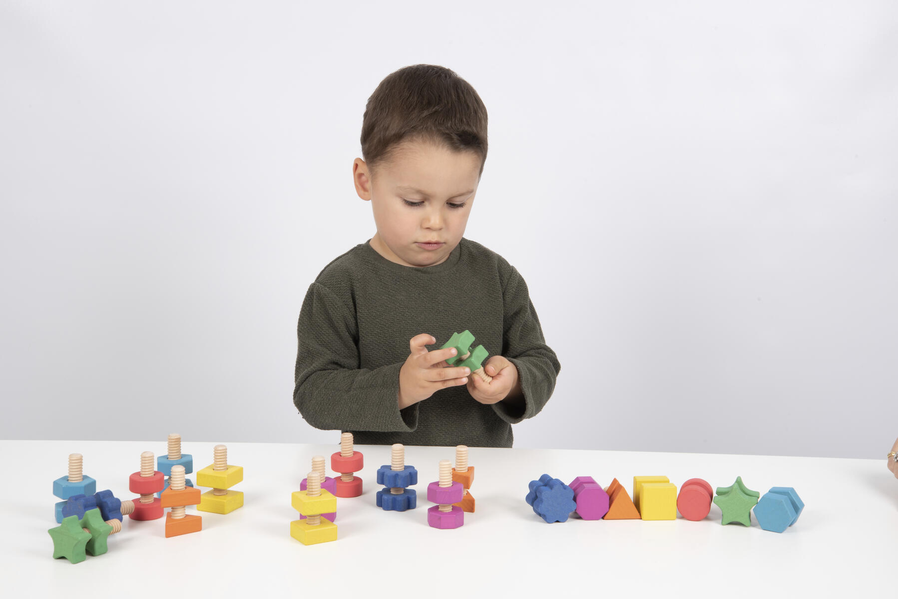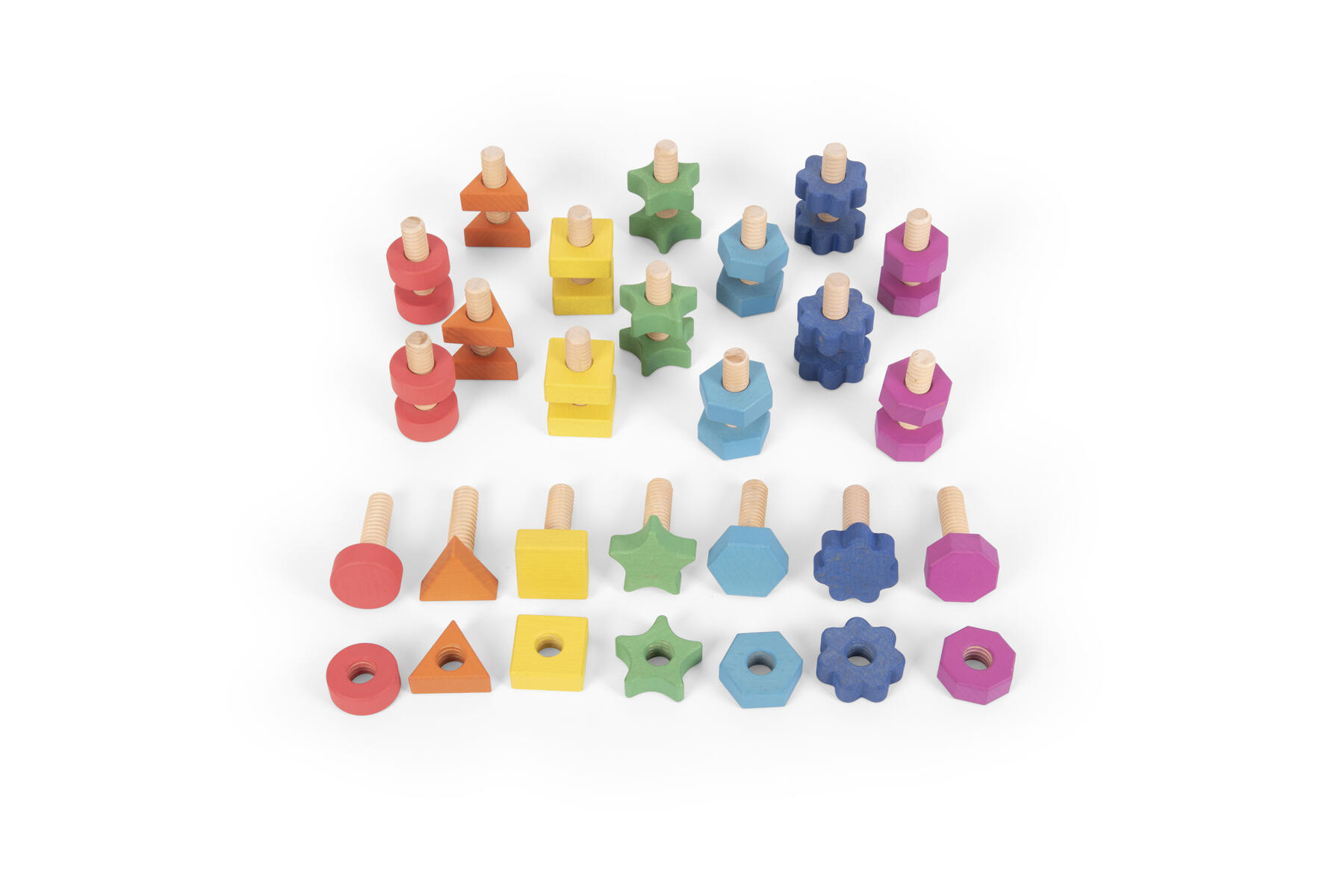 21 st/fp. Massiva muttrar och bultar i sju olika former och färger. Varje mutter har en matchande bult efter färg och form, och varje form har olika antal kanter, som ökar från 1 till 8. De tjocka bitarna passar för små barns händer. Perfekta för att lära sig mer om färg och form, räkning och finmotorisk styrka. Inkluderar bomullspåse. Från 1 år.