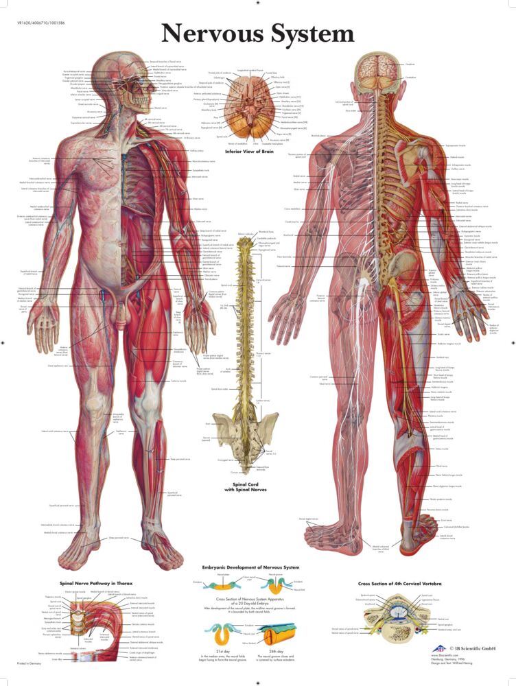Laminerad anatomisk affisch av det mänskliga nervsystemet i färgstarka detaljer. Planschen beskriver hela det mänskliga nervsystemet, inklusive den mänskliga hjärnan och ryggmärgen och är därför ett bra komplement till vårdmottagningar och klassrum. Tryckt på 200 g UV-beständigt papper och laminerad (75 µm) på båda sidor, vilket gör den stadig samt att den inte bleknar i solen. Lamineringen gör dessutom att ytan går att skrivas på med icke-permanenta färgpennor. Engelsk text.