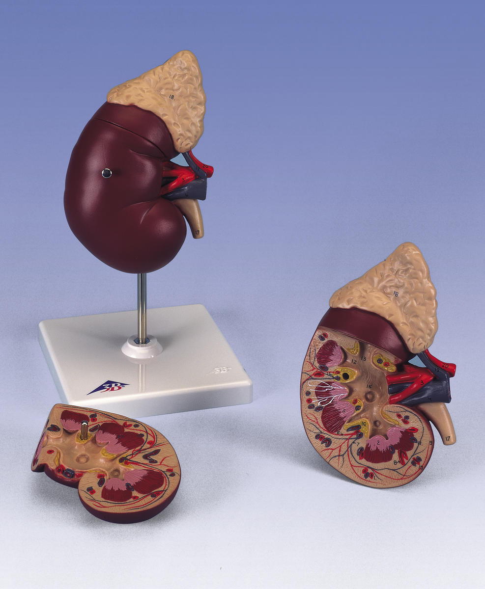 Njure i naturlig storlek i två delar från 3B Scientific® där den främre halvan av njuren är avtagbar för att möjliggöra demonstration av cortex medulla och kärl för undervisning om den mänskliga njuren. Njurbäckenet i njuren och övre delen av urinledaren visas också. Levereras på stativ. Med hjälp av QR-koden som finns på din 3B Scientific® Anatomical Model kan du ladda ner den nya 3B Smart Anatomy-appen och kliv in i den virtuella världen av mänsklig anatomi.