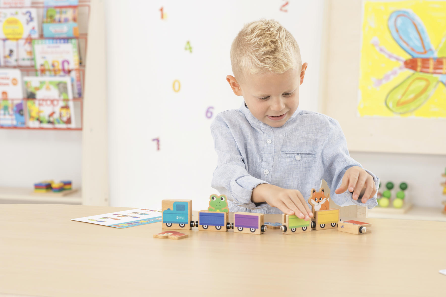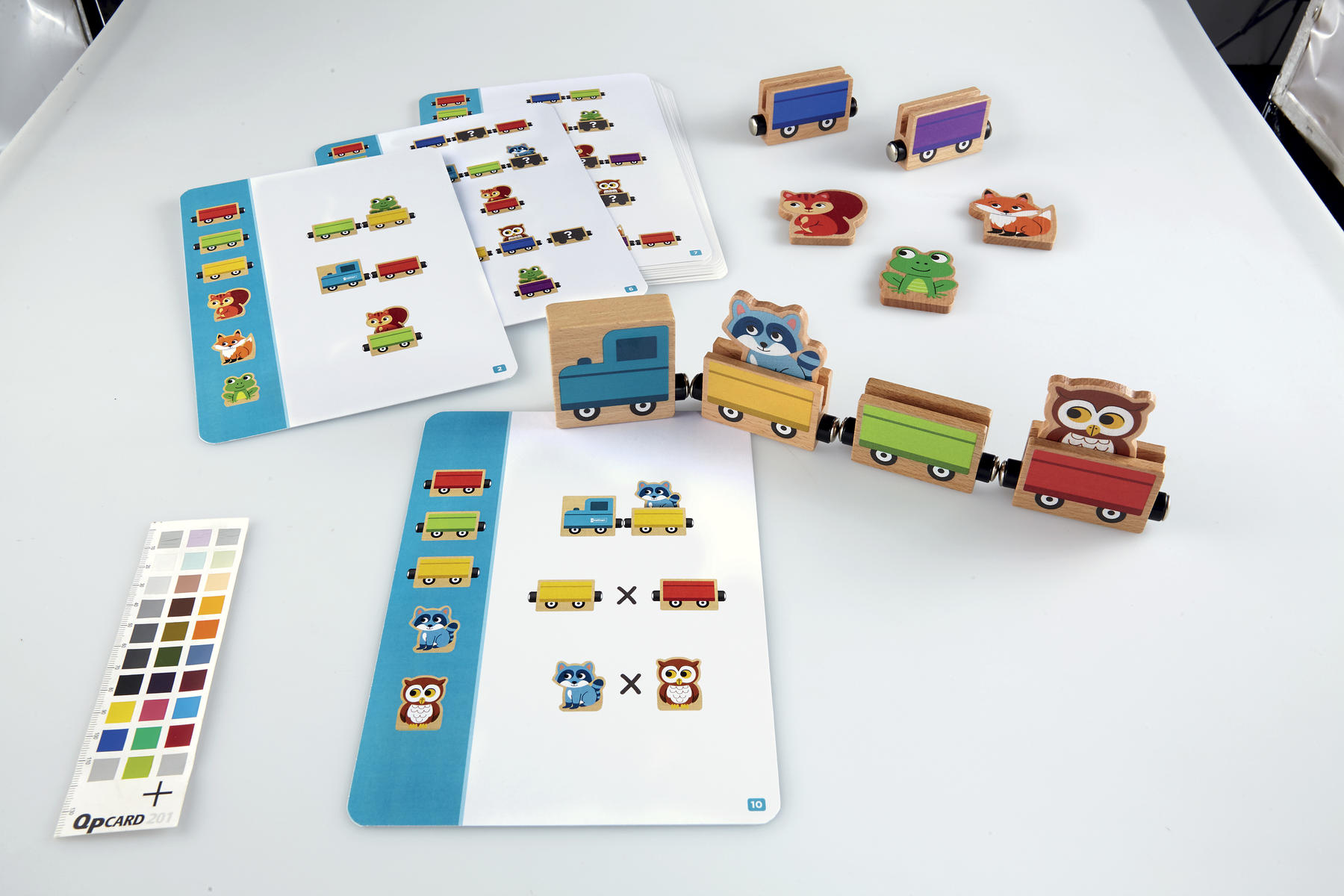Ett spel som utvecklar barnens observationsförmåga, logik samt rumsuppfattning genom att de får använda ledtrådar och tolka instruktioner för att bygga ett tåg. Arrangera vagnarna i rätt ordning med rätt djur, och vänd sedan på kortet för att se lösningen. Innehåll: 1 handledning för lärare, 11 magnetiska träblock i olika färger varav 1 lok, 5 vagnar och 5 djurfigurer samt 12 aktivitetskort.