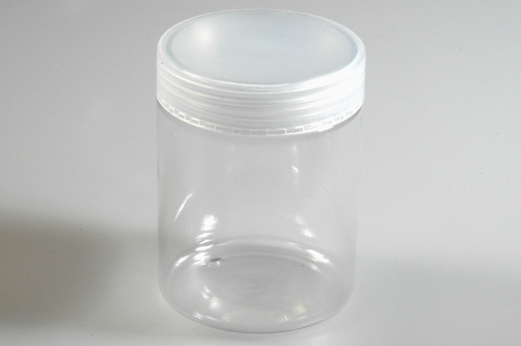 Plastburk med lock som rymmer 250 ml. ø 67 mm. Av PET och PE.