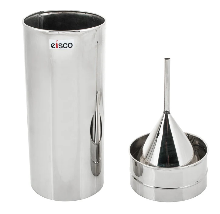 En regnmätare som består av tratt, inre mottagningskärl och en yttre kropp med en graderad cylinder av glasmått.