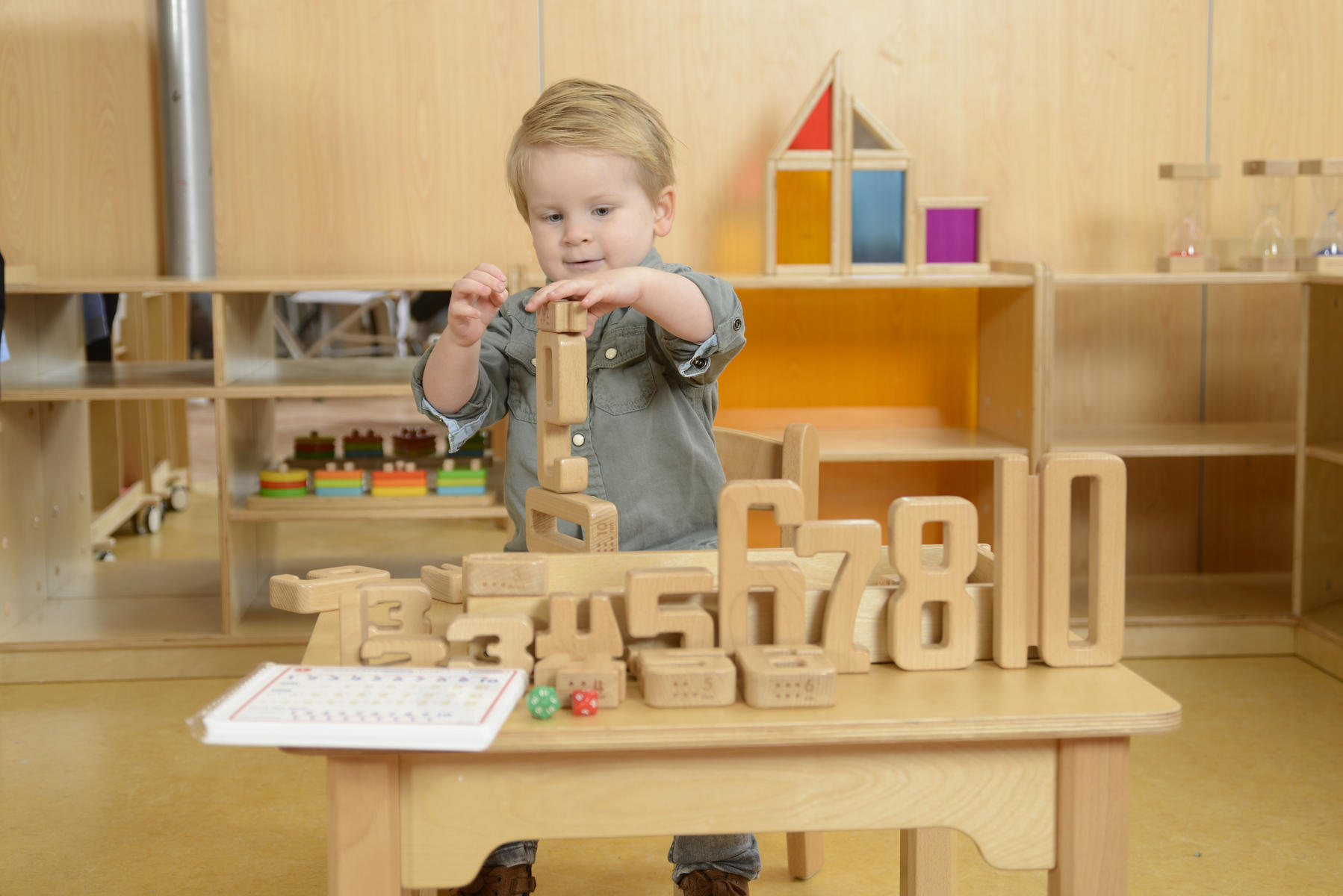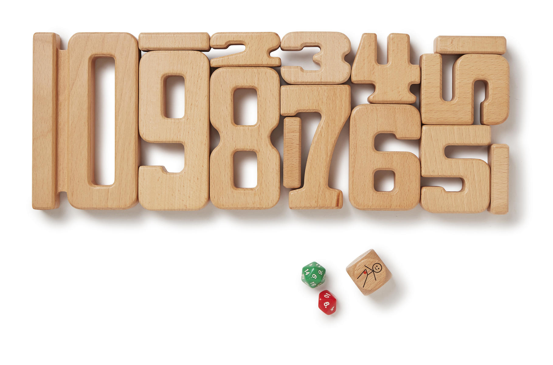 Klossar av trä som utvecklar matematiska förmågor. Satsen innehåller siffrorna 1–10. Höjden på varje siffra står i proportion till respektive antal kvantiteter, t.ex. är höjden på nummer 5 lika med höjden av 3 och 2 staplade på varandra. Detta ger både taktila och visuella upplevelser. Av FSC-märkt bokträ. Levereras i praktisk förvaringslåda av trä. Från 3 år.