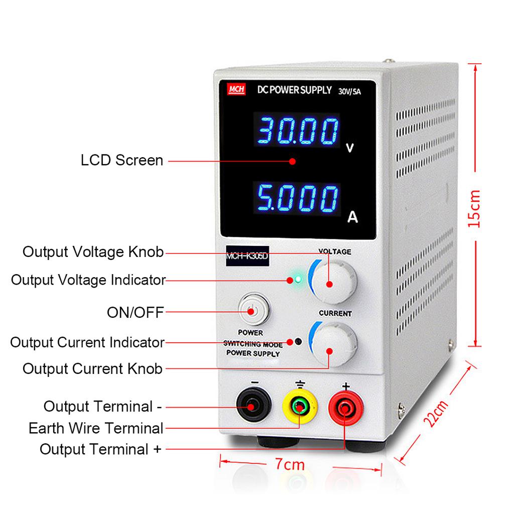 Likspänning 0-30V stabiliserad. Ström 0-5A. Rippel < 50mV.