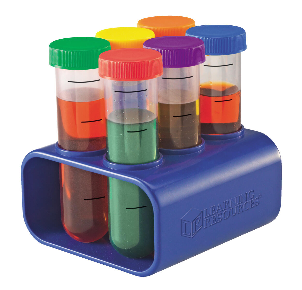 6 provrör med flerfärgade skriv-och-torka-av-lock för märkning. Provrörshållare och aktivitetsguide. Av ABS och PP. Från 3 år. Höjd: 16 cm Diameter: 4 cm
