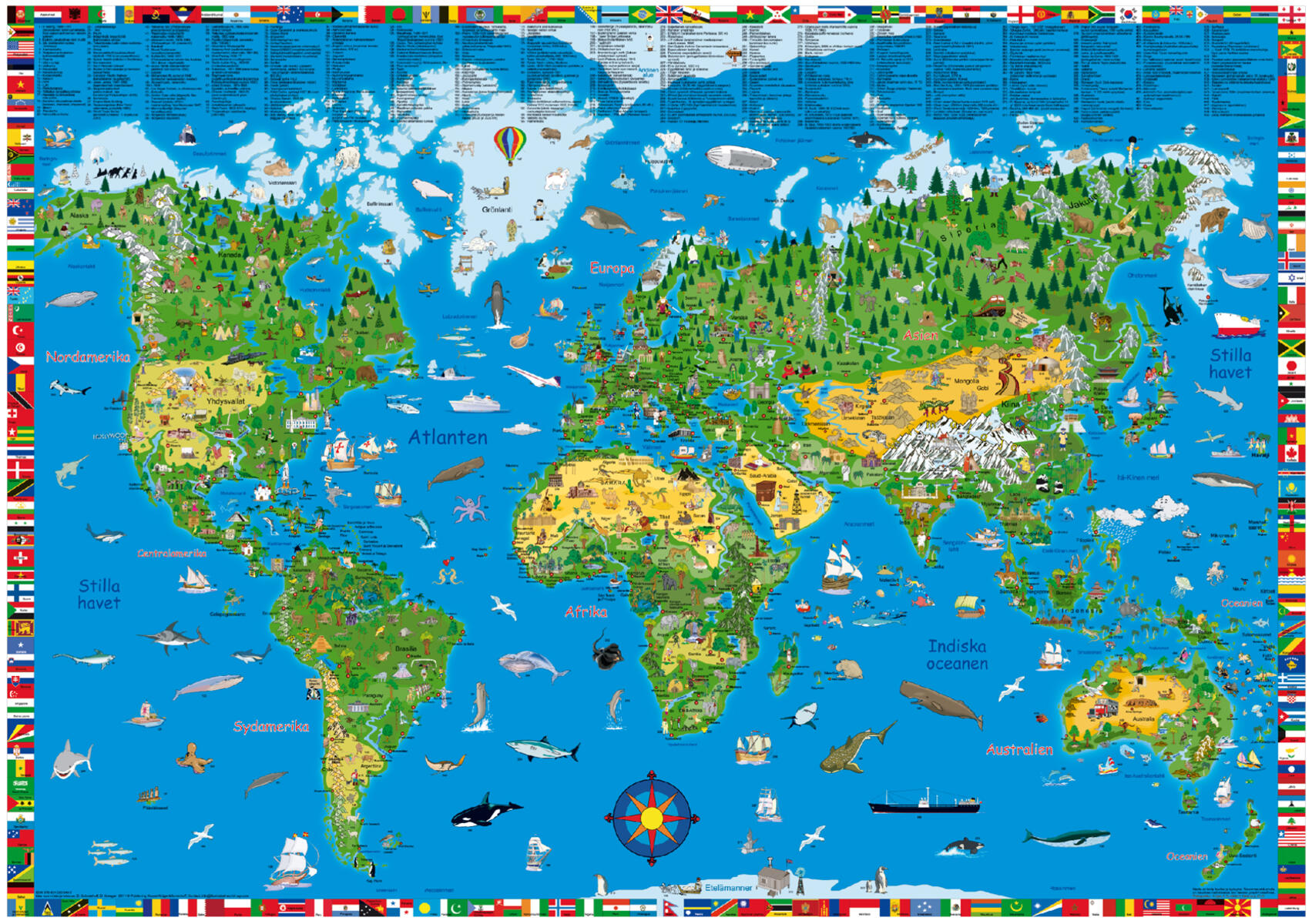 Världskarta med länder, hav, större floder och berg. Mått 100×70 cm. Le...