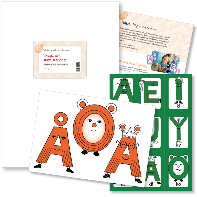 Ett talträningsmaterial i serien "Talträning". Levereras i mapp med ark med figurer och kort att själv klippa till. Nio vokalljud (vokalgubbar) och 16 konsonantljud (stavelsegubbar) att leka, spela och träna med. Handledning ingår.